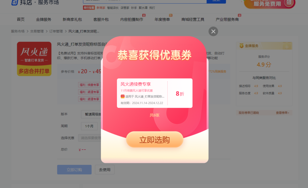 风火递新老客户,可在抖店服务市场,领取专属优惠券,享受特惠订购福利!