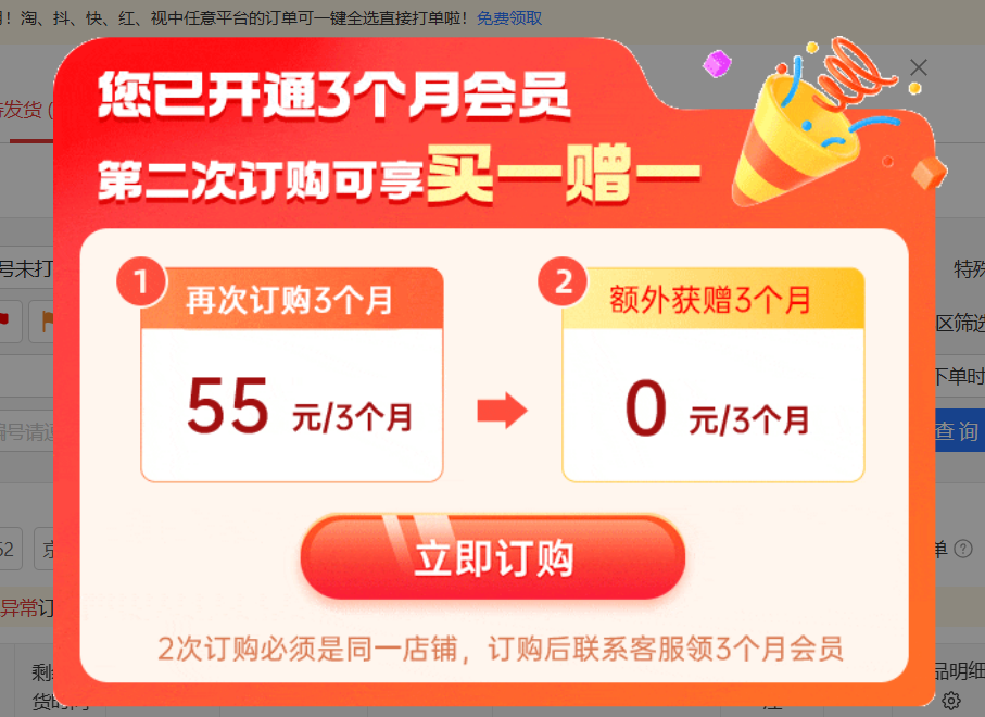 续费用户订购一笔订单后,续订订单即参与受买一送一福利活动。